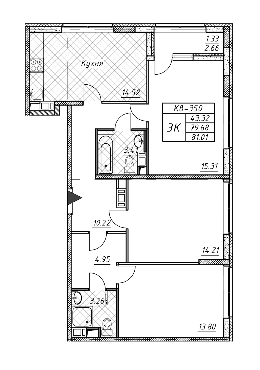 Трёхкомнатная квартира на 10-ом этаже 81,01 кв.м