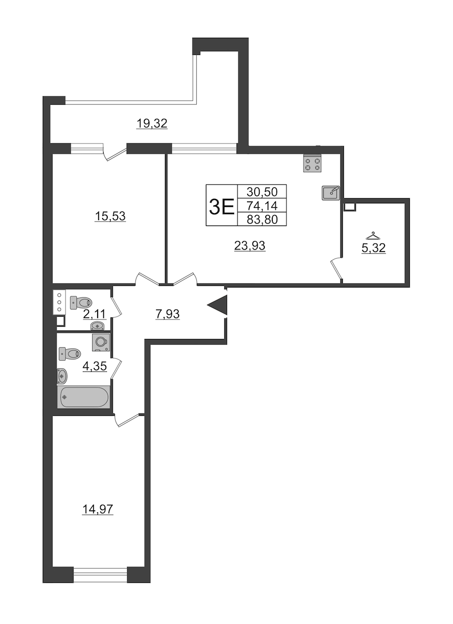 Двухкомнатная квартира на 3-ем этаже 79,6 кв.м