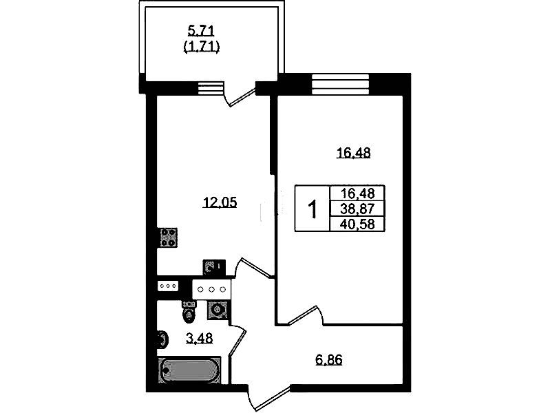 Однокомнатная квартира на 5-ом этаже 40,2 кв.м