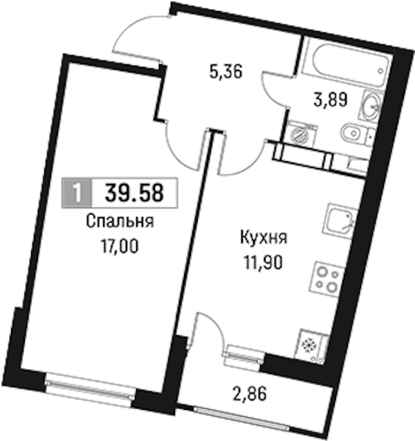 Однокомнатная квартира на 13-ом этаже 39,58 кв.м