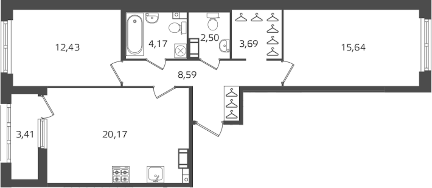 Двухкомнатная квартира на 11-ом этаже 67,19 кв.м