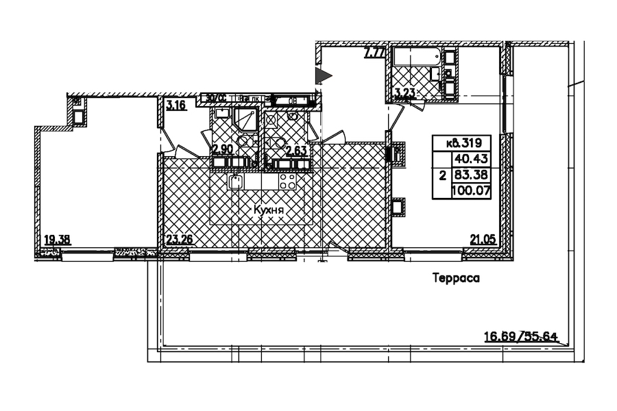 Двухкомнатная квартира на 16-ом этаже 100,07 кв.м