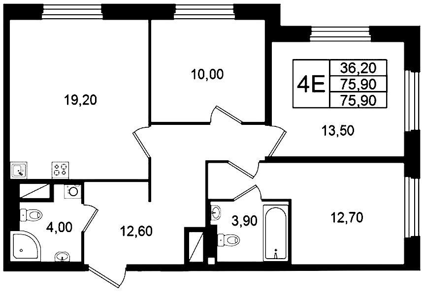 Трёхкомнатная квартира на 4-ом этаже 75,9 кв.м