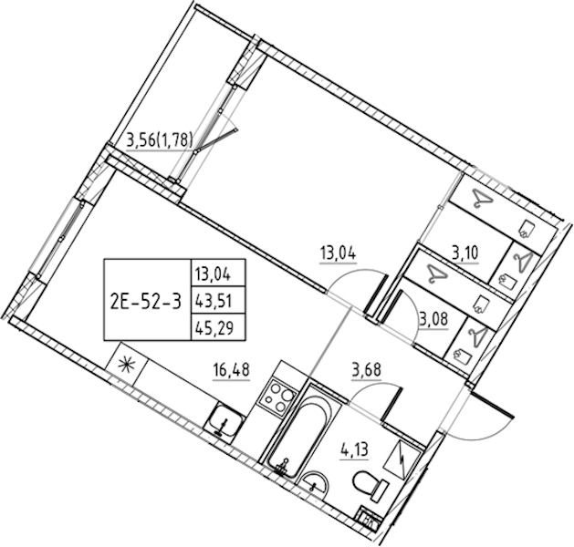 Однокомнатная квартира на 3-ем этаже 45,29 кв.м