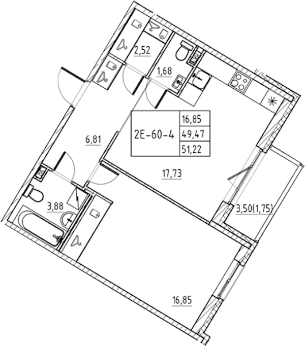 - Площадь51,22 м2