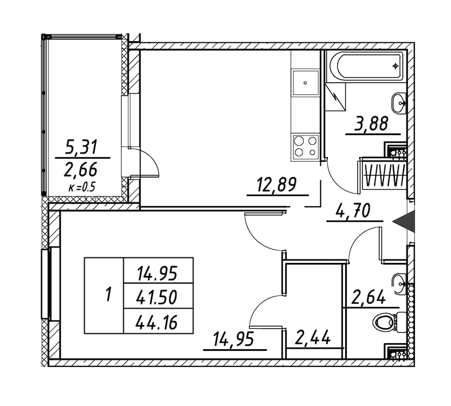 Однокомнатная квартира на 8-ом этаже 44,16 кв.м
