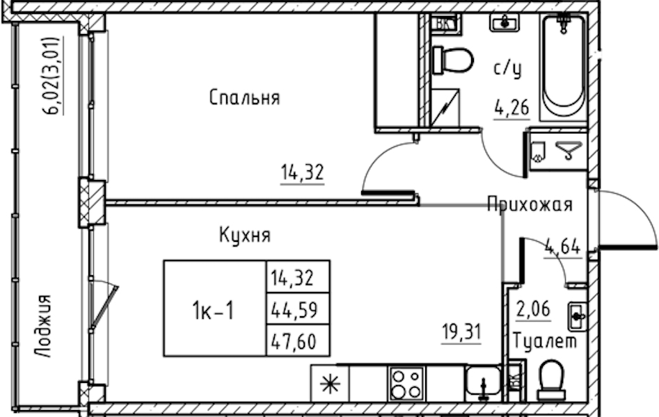 - Площадь47,6 м2