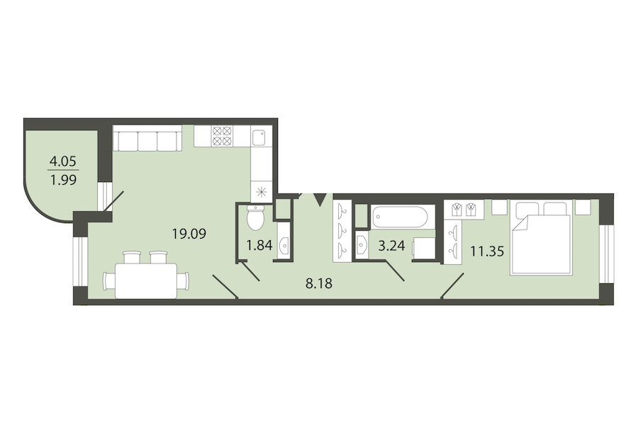 Однокомнатная квартира на 1-ом этаже 45,69 кв.м