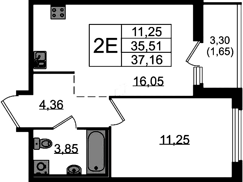 Однокомнатная квартира на 15-ом этаже 37,16 кв.м
