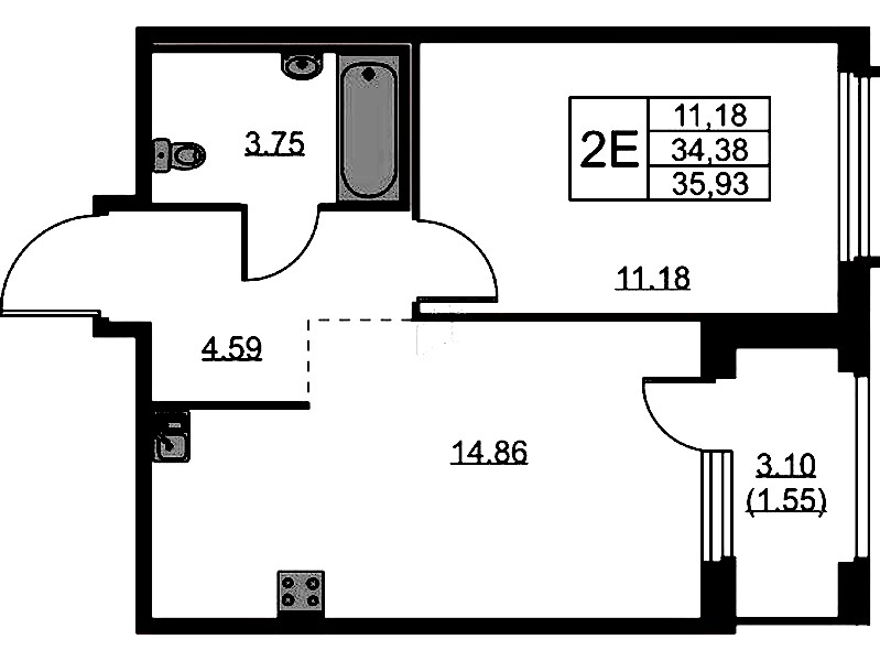 Однокомнатная квартира на 13-ом этаже 35,93 кв.м