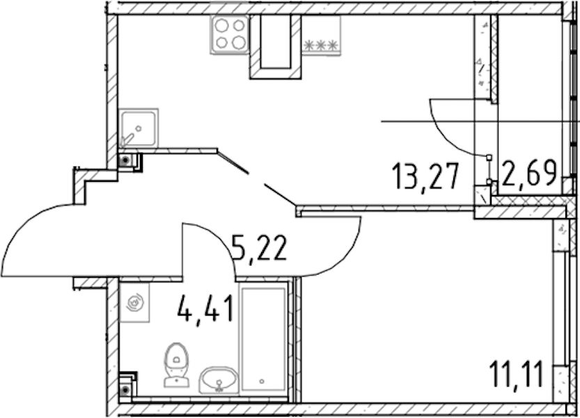 - Площадь кухни13,27 м2