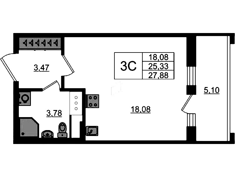 Квартира-студия на 3-ем этаже 25,33 кв.м