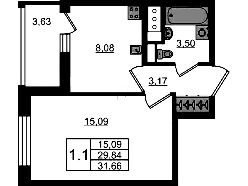 Однокомнатная квартира на 13-ом этаже 29,84 кв.м