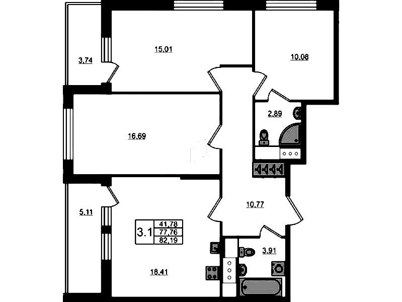 Трёхкомнатная квартира на 4-ом этаже 77,76 кв.м