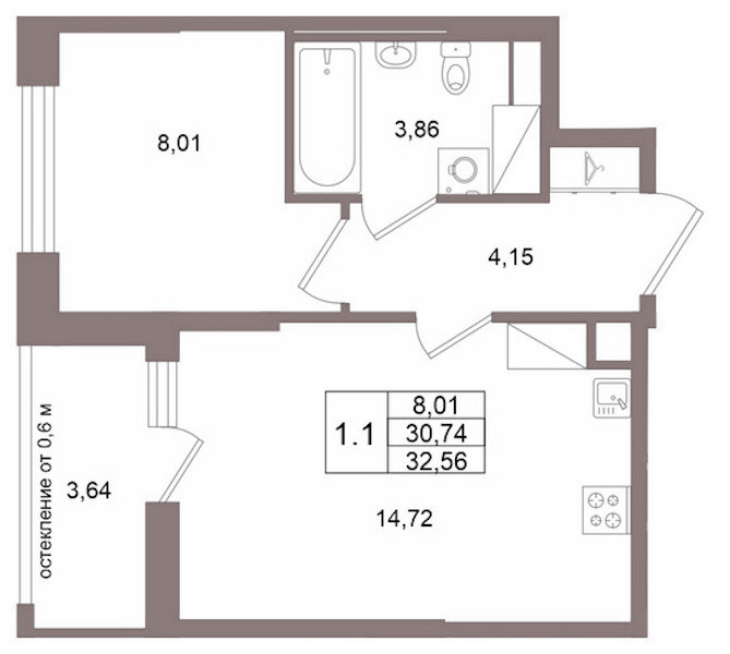 Однокомнатная квартира на 7-ом этаже 30,74 кв.м