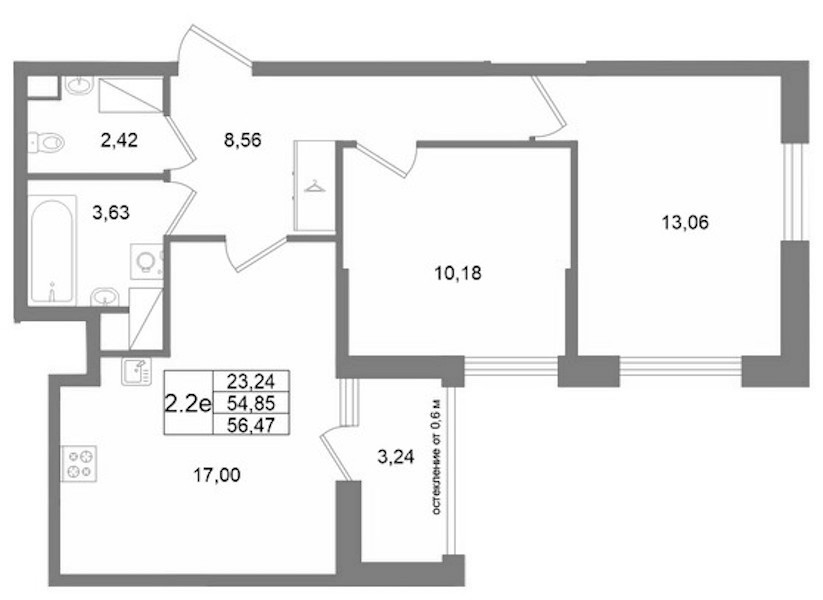 Двухкомнатная квартира на 15-ом этаже 54,85 кв.м