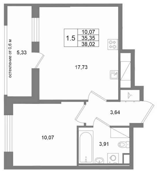 Однокомнатная квартира на 18-ом этаже 35,35 кв.м