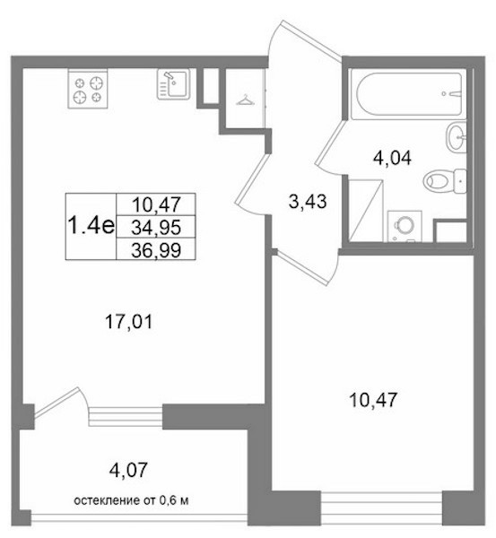 Однокомнатная квартира на 3-ем этаже 34,95 кв.м