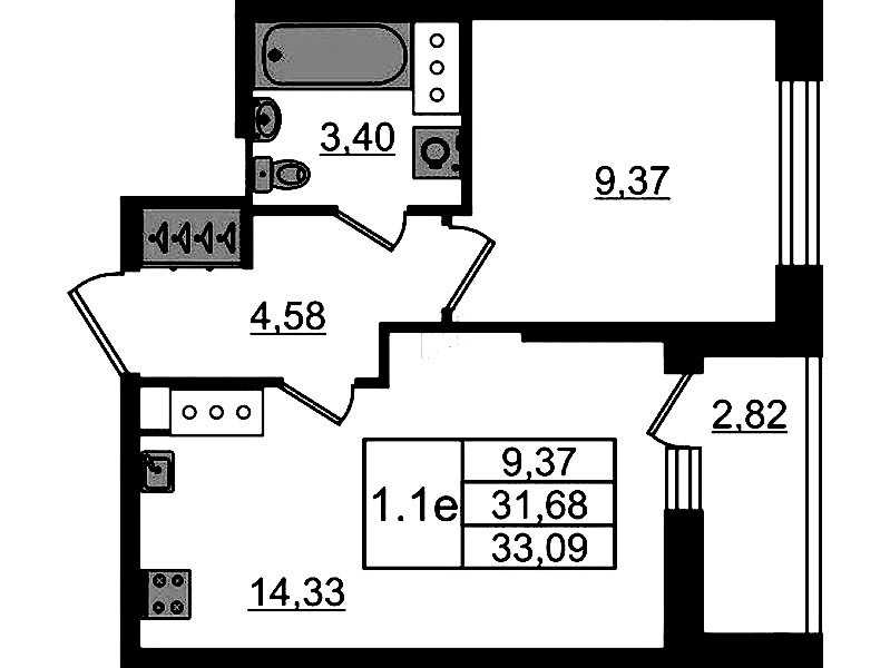 Однокомнатная квартира на 15-ом этаже 31,68 кв.м