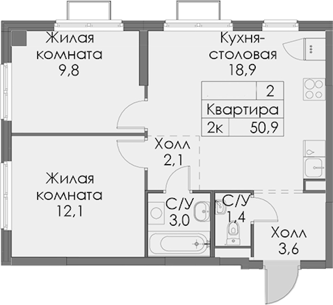 Двухкомнатная квартира на 12-ом этаже 50,9 кв.м