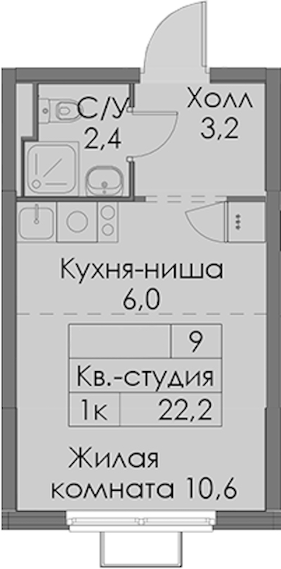 Квартира-студия на 6-ом этаже 22,2 кв.м