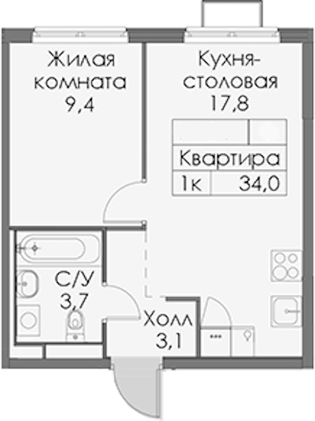 Однокомнатная квартира на 15-ом этаже 34 кв.м
