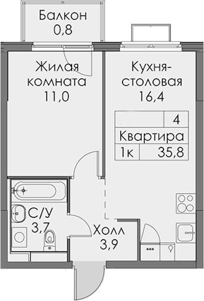 Однокомнатная квартира на 13-ом этаже 35,8 кв.м