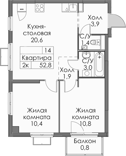 - Площадь52,8 м2