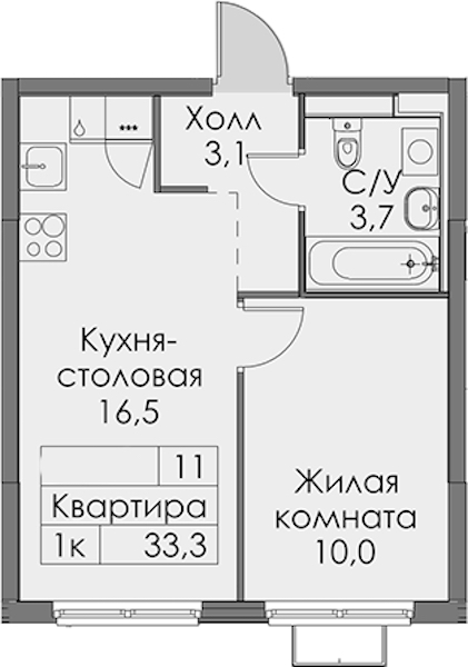Однокомнатная квартира на 13-ом этаже 33,3 кв.м