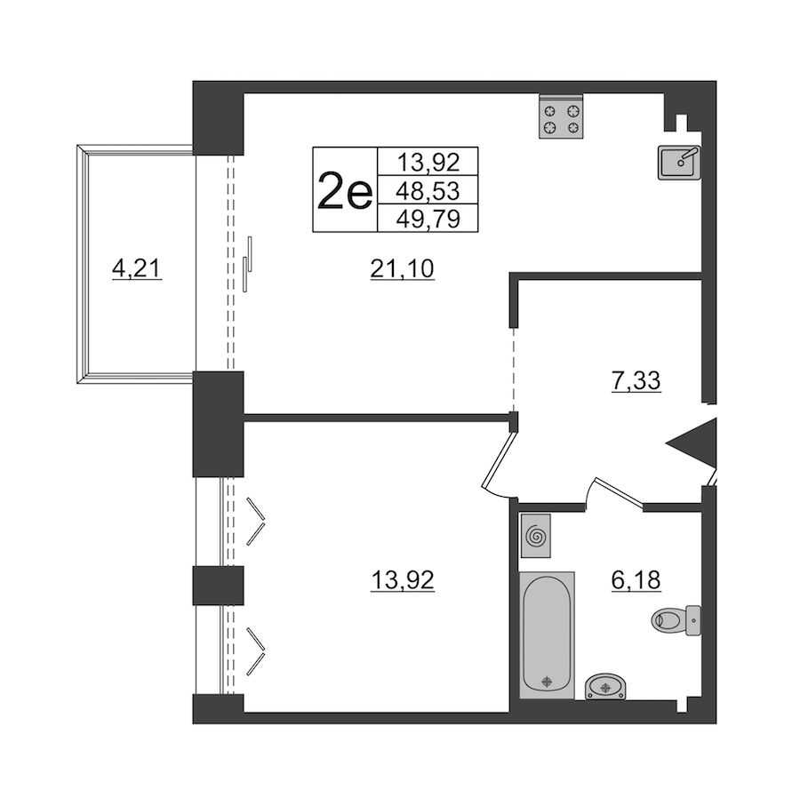 Однокомнатная квартира на 4-ом этаже 48,53 кв.м