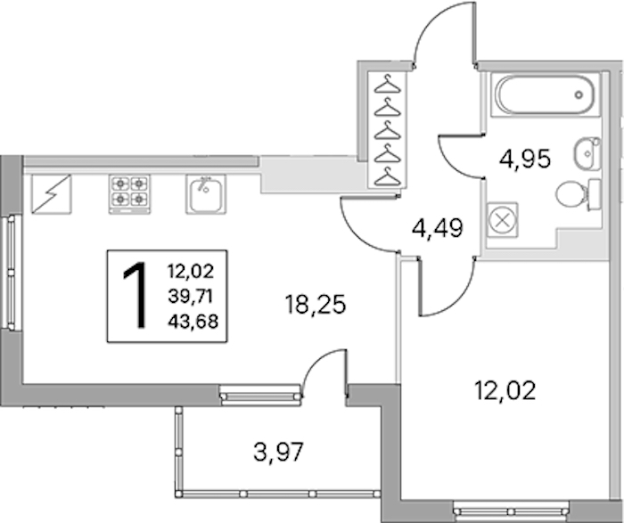 Однокомнатная квартира на 1-ом этаже 39,71 кв.м