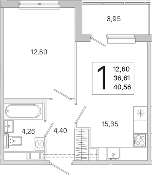 Однокомнатная квартира на 3-ем этаже 36,61 кв.м