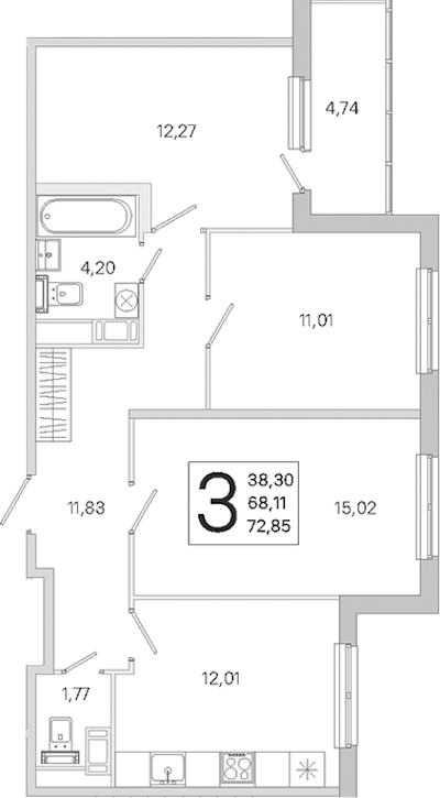 Трёхкомнатная квартира на 4-ом этаже 68,11 кв.м