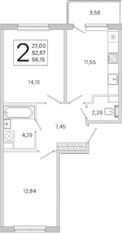 Двухкомнатная квартира на 2-ом этаже 52,57 кв.м