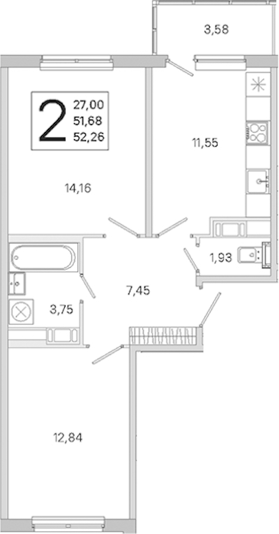 - Площадь51,68 м2