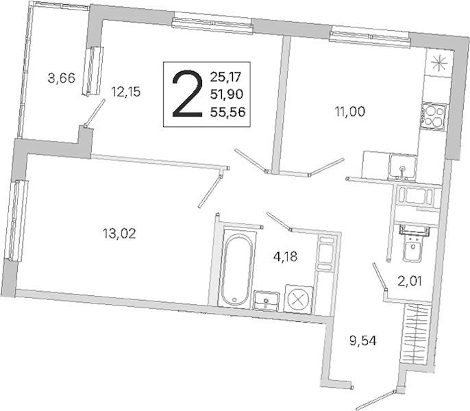 Двухкомнатная квартира на 4-ом этаже 51,9 кв.м