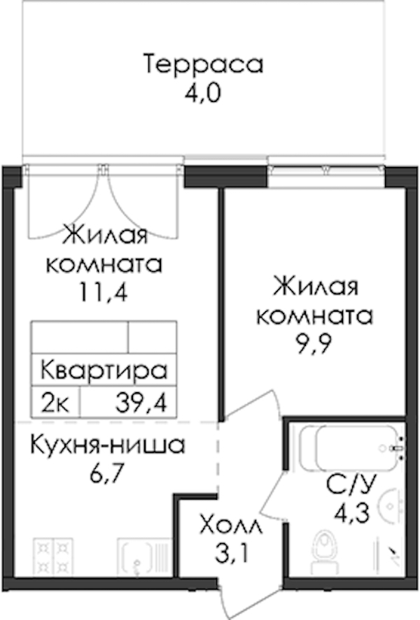 • Площадь39,4 м2