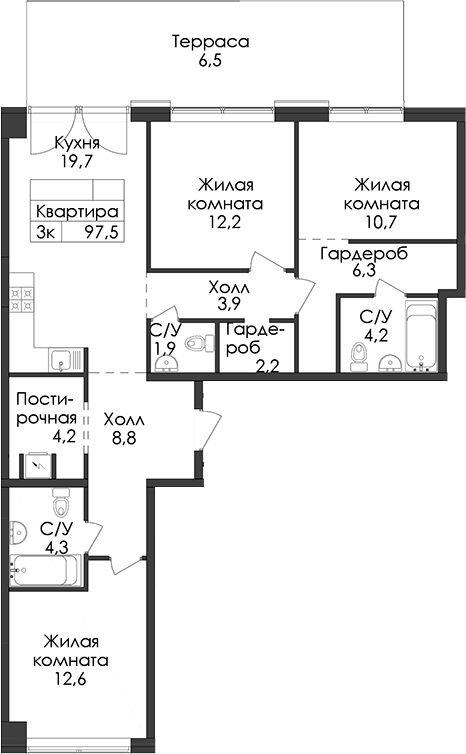 Трёхкомнатная квартира на 1-ом этаже 97,5 кв.м