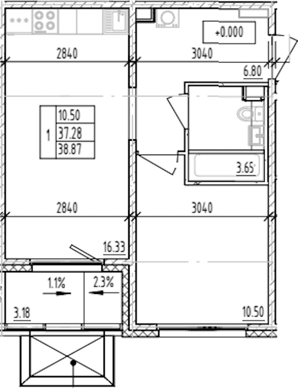 Однокомнатная квартира на 1-ом этаже 38,87 кв.м