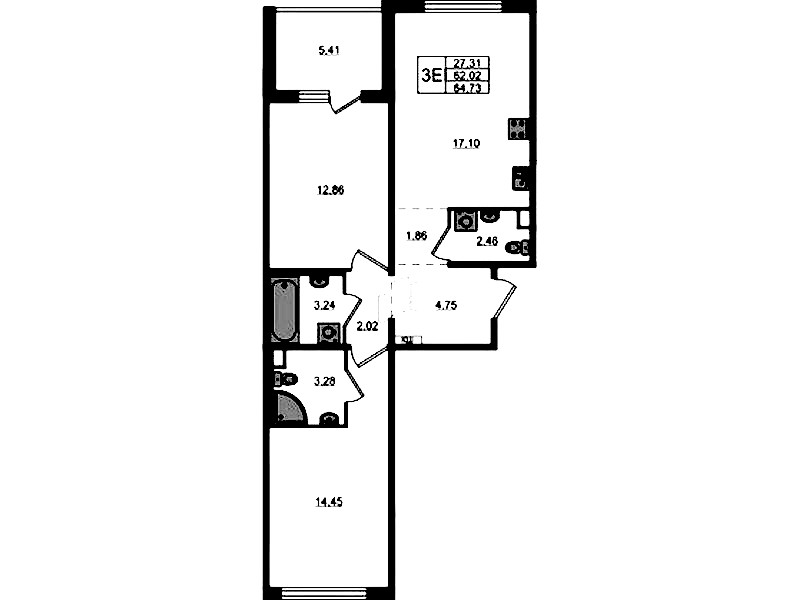 Двухкомнатная квартира на 10-ом этаже 64,73 кв.м