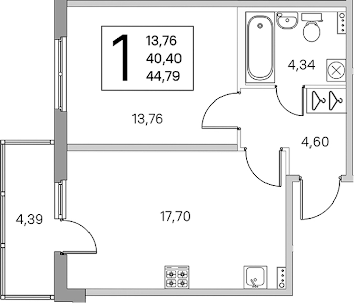Однокомнатная квартира на 1-ом этаже 41,72 кв.м
