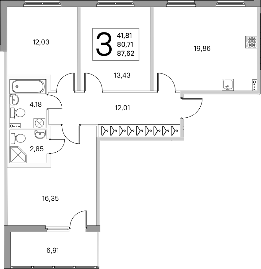 Трёхкомнатная квартира на 2-ом этаже 84,17 кв.м