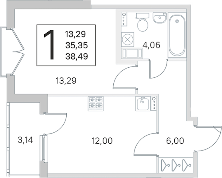 Однокомнатная квартира на 3-ем этаже 35,35 кв.м
