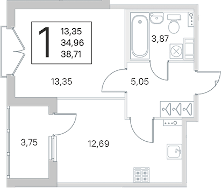 Однокомнатная квартира на 4-ом этаже 34,96 кв.м