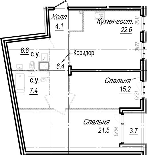 Двухкомнатная квартира на 3-ем этаже 86,9 кв.м