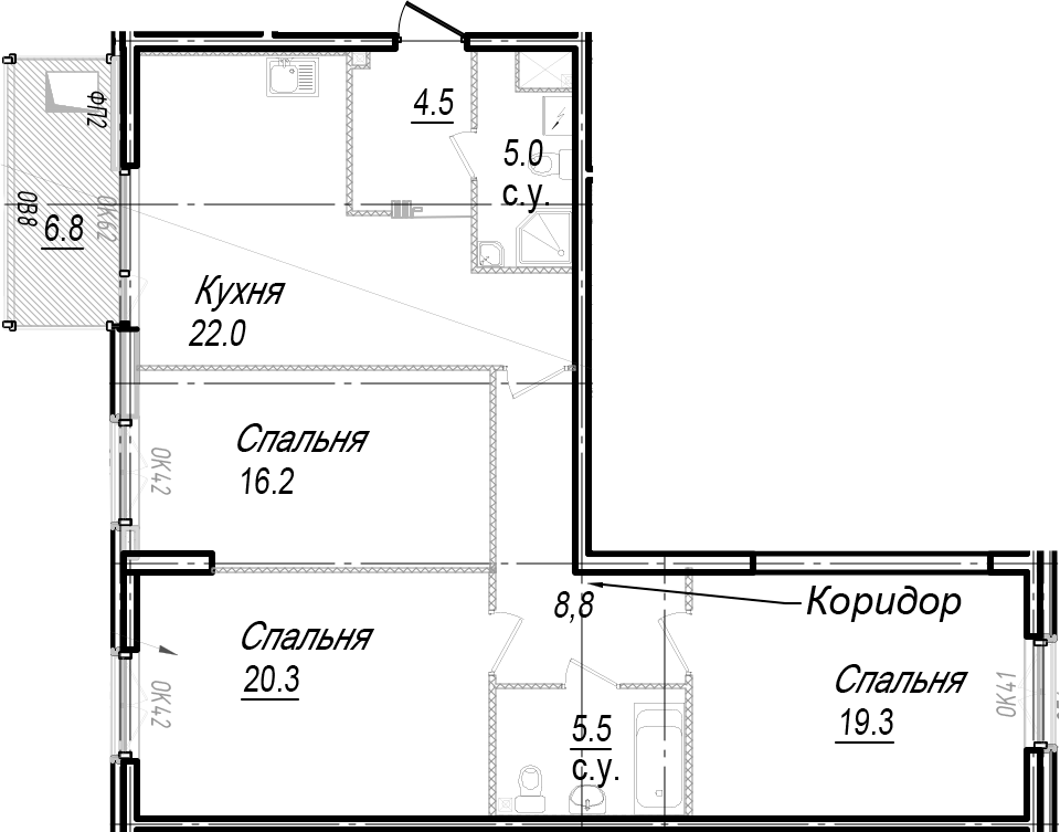 • Площадь кухни22 м2