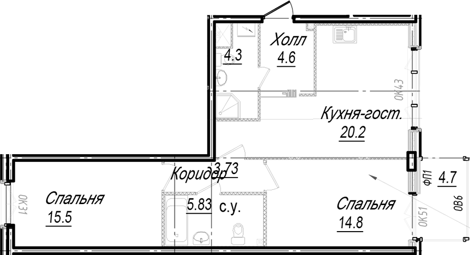 Двухкомнатная квартира на 6-ом этаже 70,2 кв.м