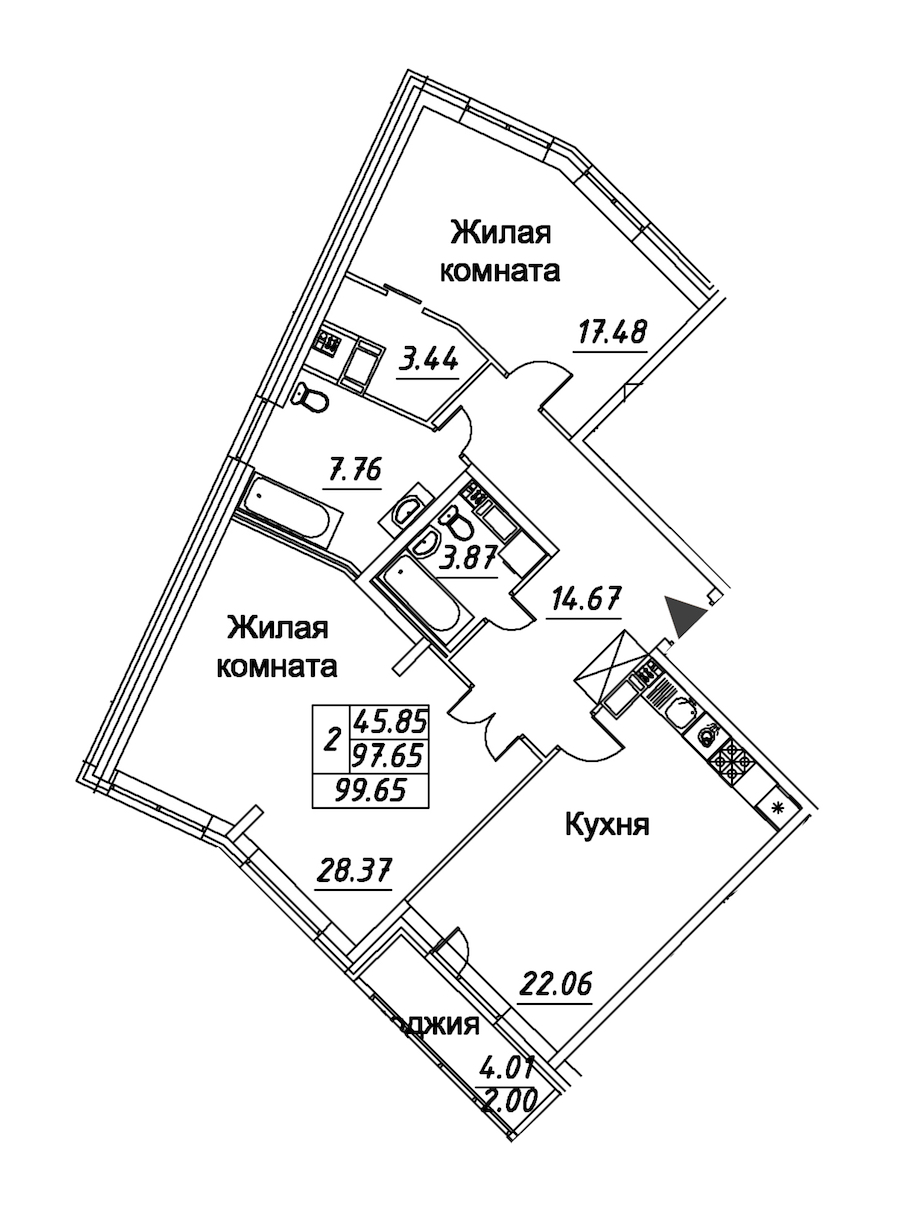 Двухкомнатная квартира на 3-ем этаже 99,65 кв.м