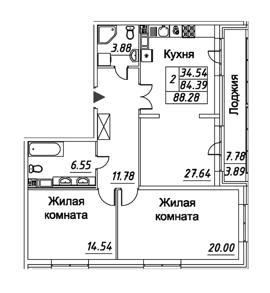 Двухкомнатная квартира на 6-ом этаже 88,28 кв.м