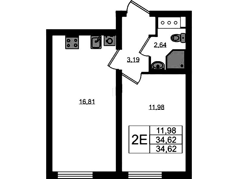 Однокомнатная квартира на 17-ом этаже 34,62 кв.м